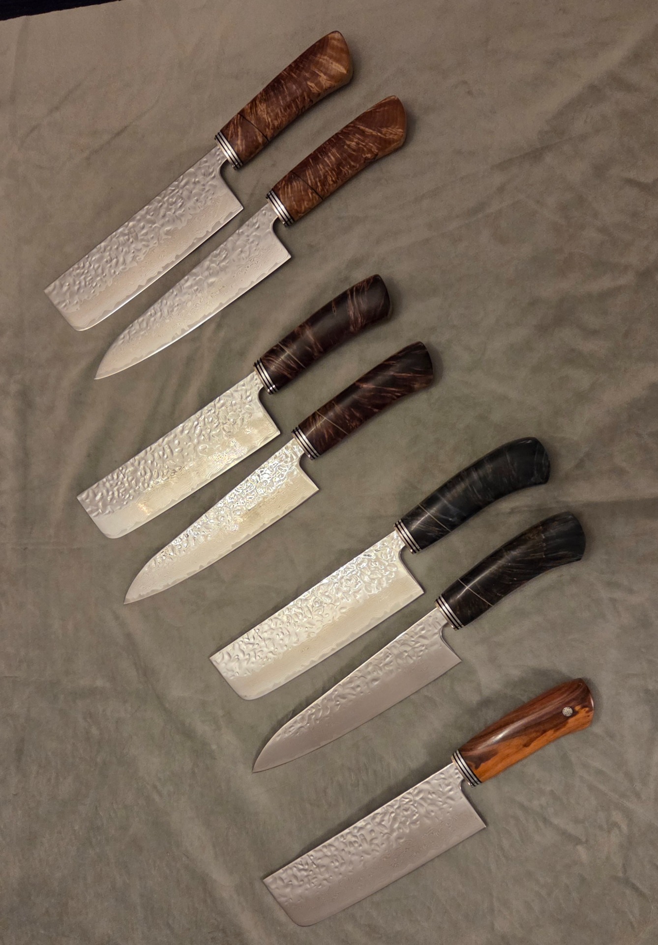 Bladen nedan är Hokiyama Gyoto 210, Gyoto 180 och Nakiri 165 damascus. De är tillverkade av rosttrögt AUS-10 stål med 67 lager damaskus, härdat till 60-61 HRC.