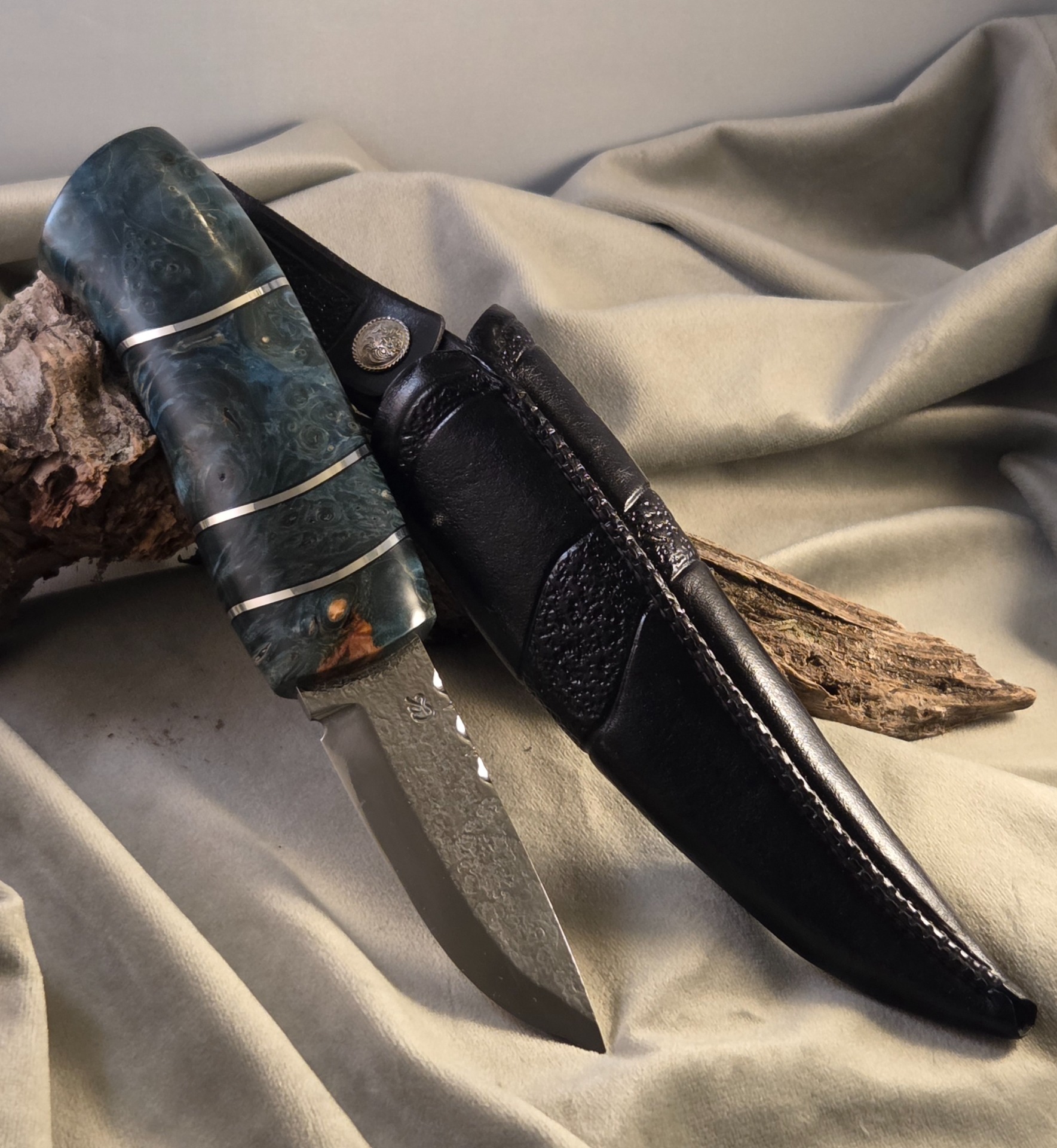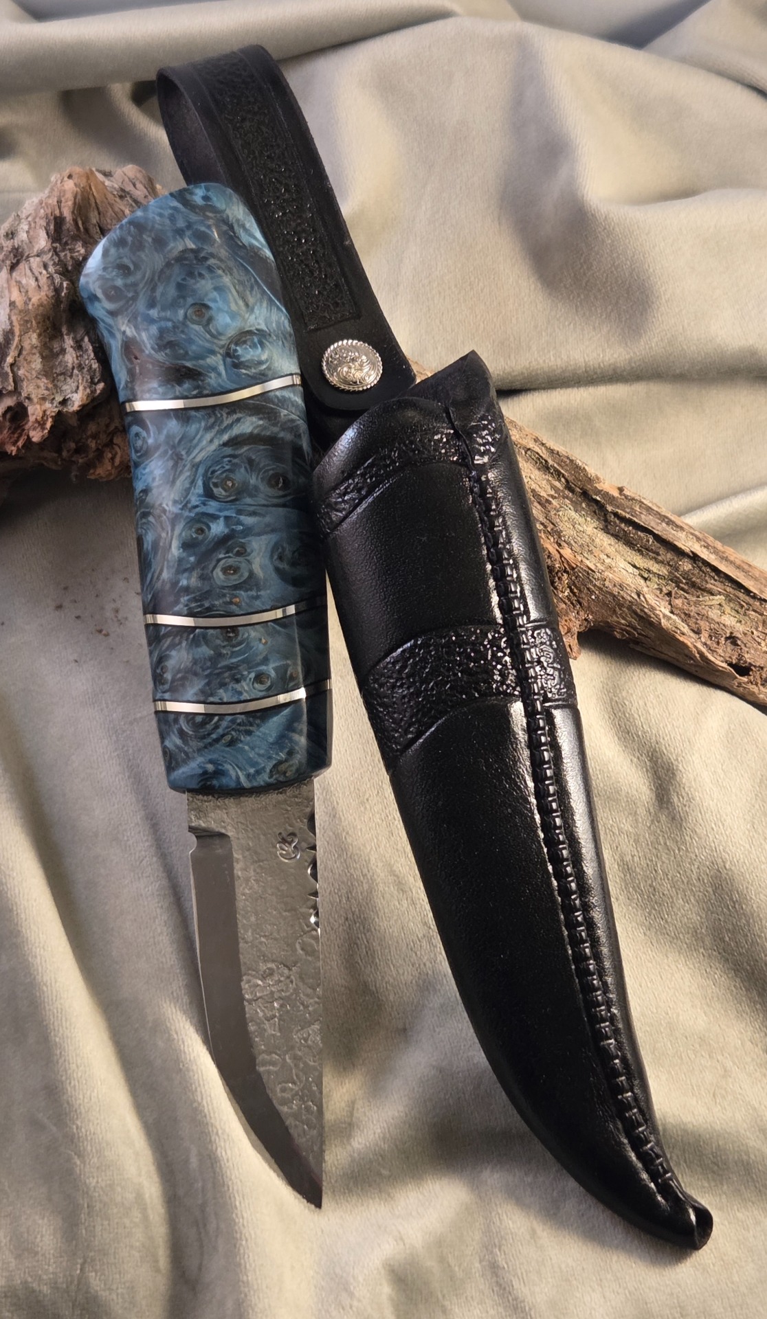 Damastblad av S-Å Larsson. Skaft av stabiliserad sälg.