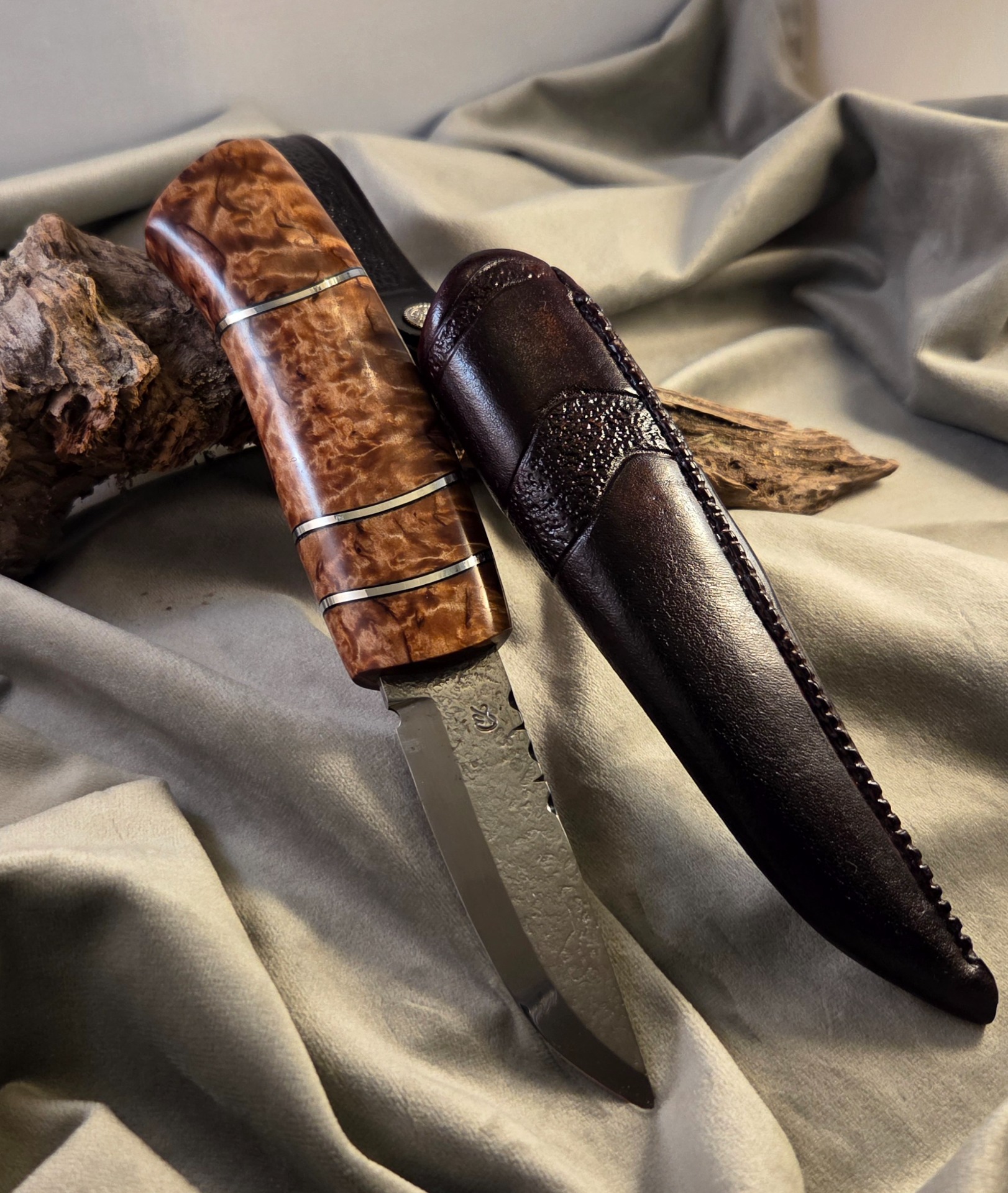 Skaft av stabiliserad masurbjörk, front av obehandlad masur samt detaljer av älghorn och tenn.