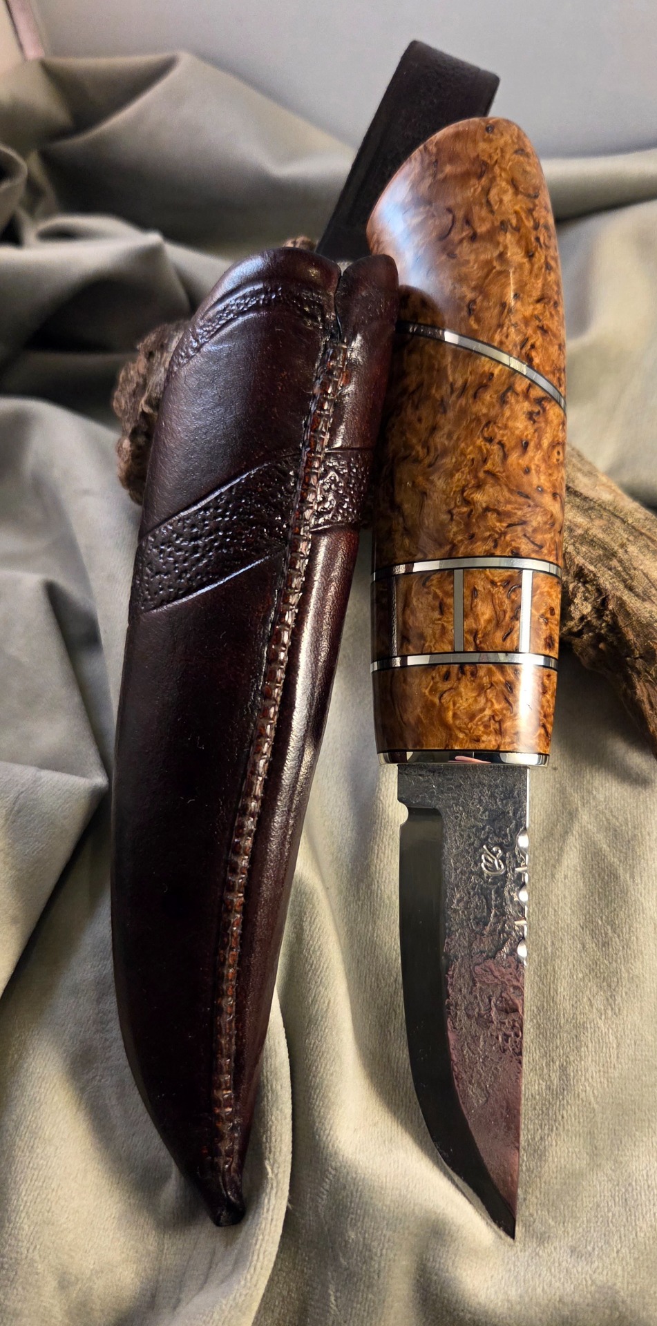 Damastblad av Ingemar Nordell. Skaft av stabiliserad björkvril, front och detalj av stabiliserad masurbjörk. Övriga detaljer av tenn och vulkanfiber.