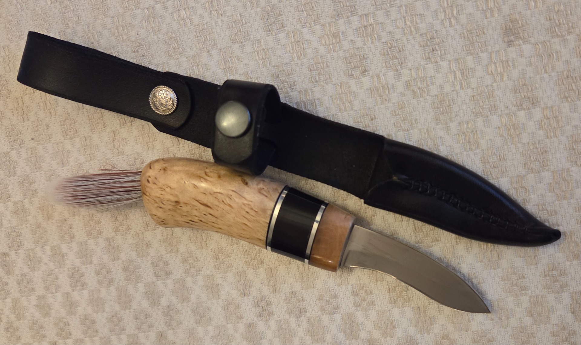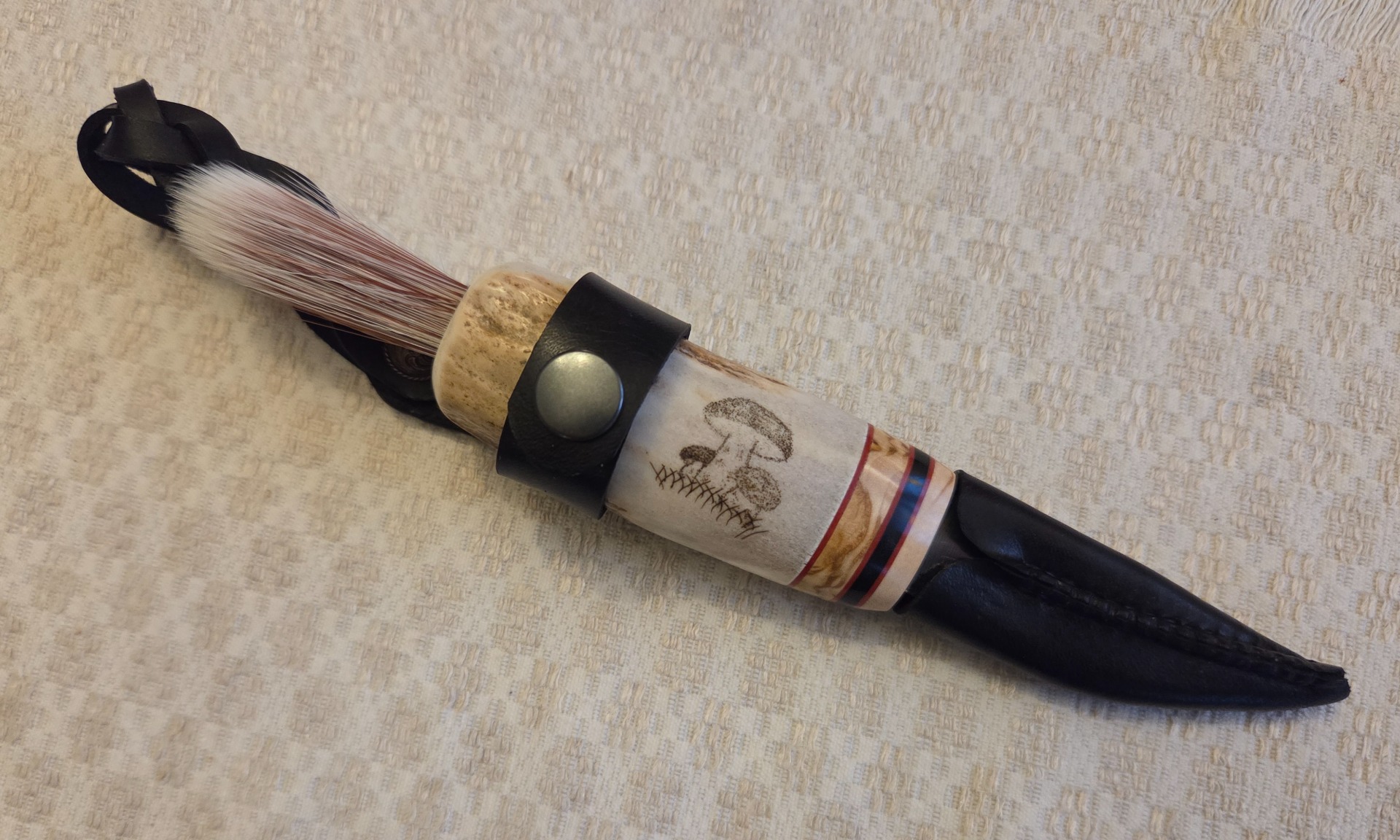 Svampkniv med rostfritt blad. Front av stabiliserad masurbjörk. Skaft av färgad masurbjörk och med detaljer av buffelhorn och tenn.